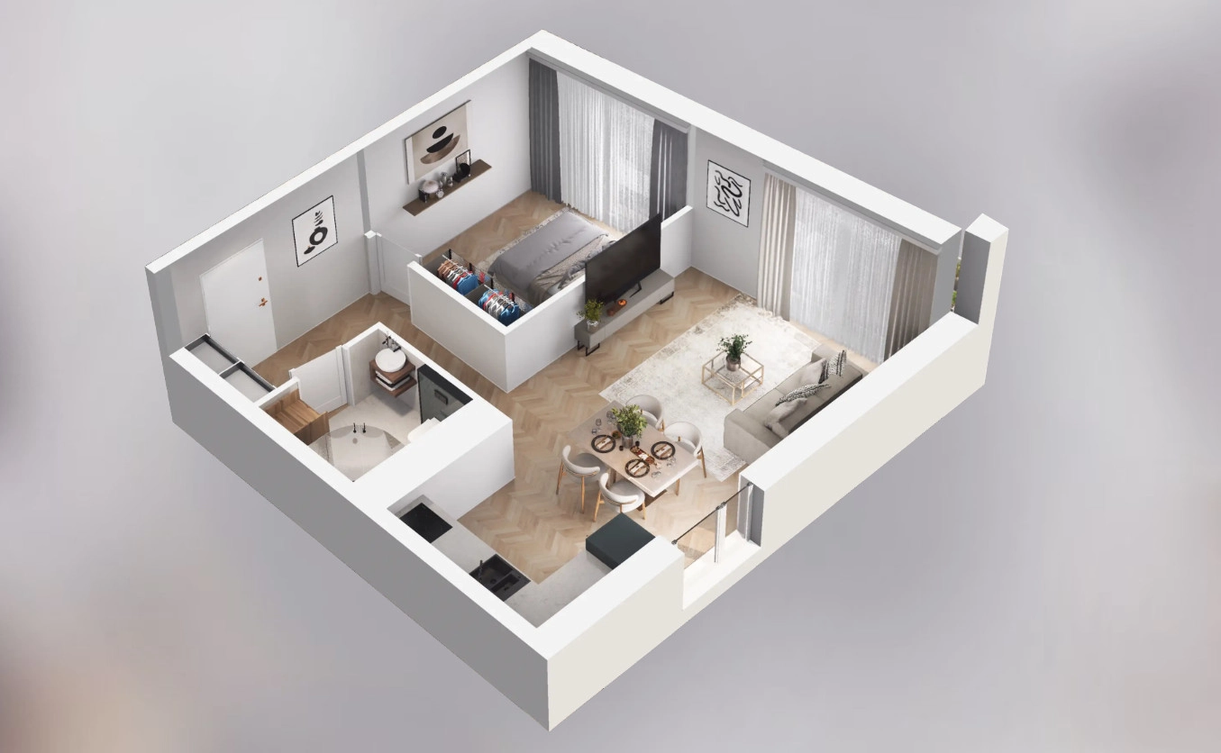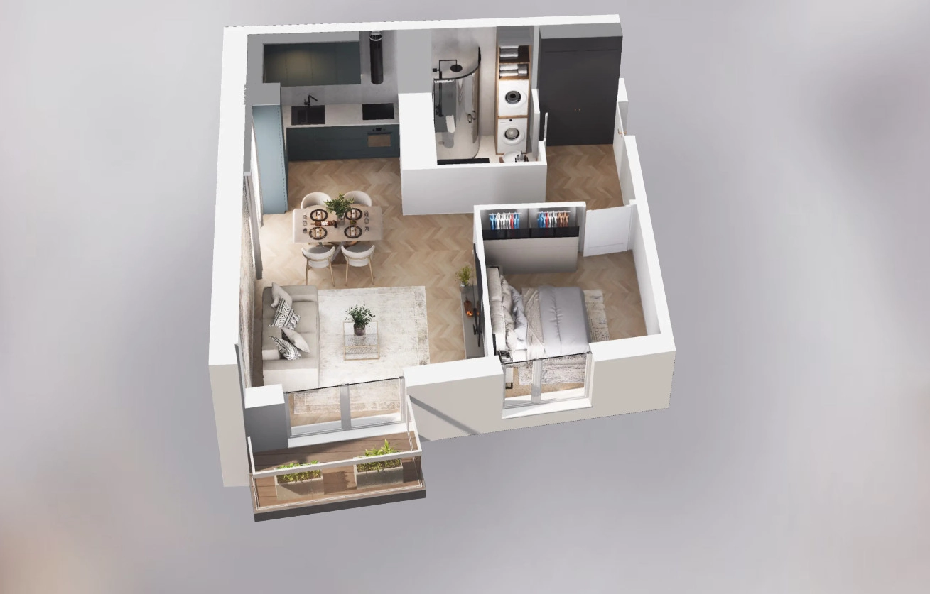 Rzut oraz wizualizacje w ofercie przedstawiają przykładowy sposób aranżacji wnętrza. Powyższa oferta ma charakter informacyjny i nie stanowi oferty handlowej w rozumieniu art. 66 §1 Kodeksu Cywilnego.
