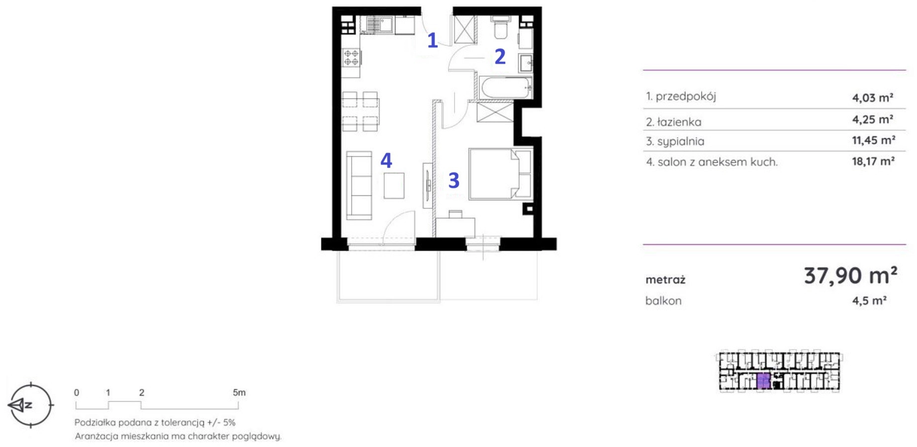 Powierzchnia: 37,90 m² • Balkon: 4,5 m² • Układ: 2 pokoje • Piętro: 1. • Planowane oddanie: IV.2026