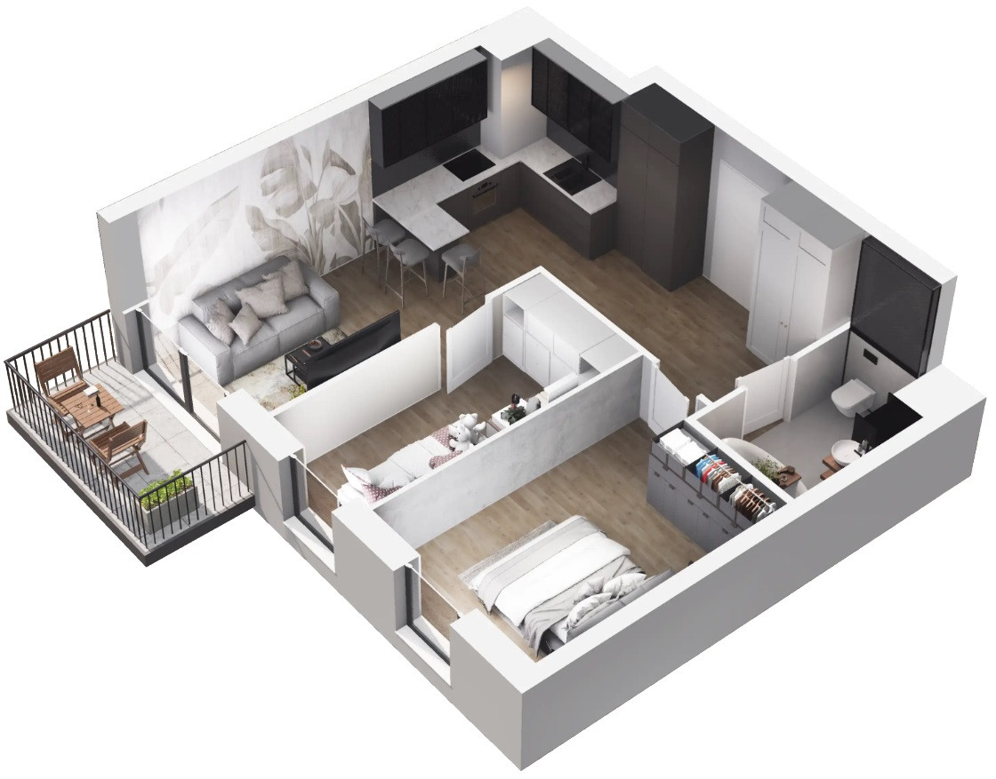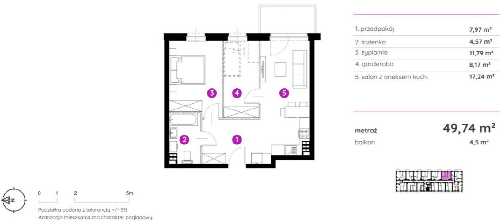 Powierzchnia: 49,74 m² • Balkon: 4,5 m² • Układ: 2 pokoje + garderoba • Piętro: 3 • Planowane oddanie: IV.2026r