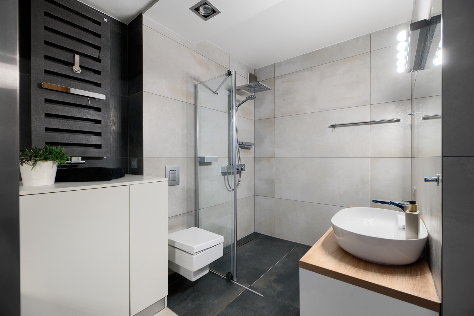 Łazienka przeszła remont około trzy lata temu i została wyposażona w prysznic, WC Duravit, umywalkę, pralkę w zabudowie, grzejnik Zehnder oraz armaturę Hans-Grohe i Kueco.