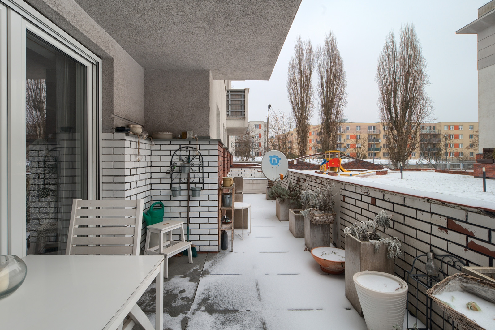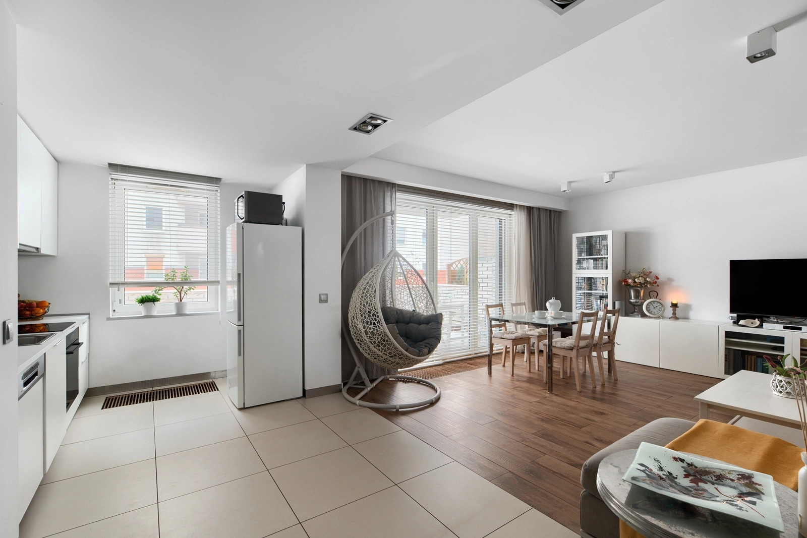 W mieszkaniu zamontowano trzy grzejniki kanałowe, elektryczne rolety zewnętrzne, moskitiery we wszystkich oknach (w drzwiach tarasowych moskitiera harmonijkowa) oraz białe żaluzje drewniane od strony wnętrza.