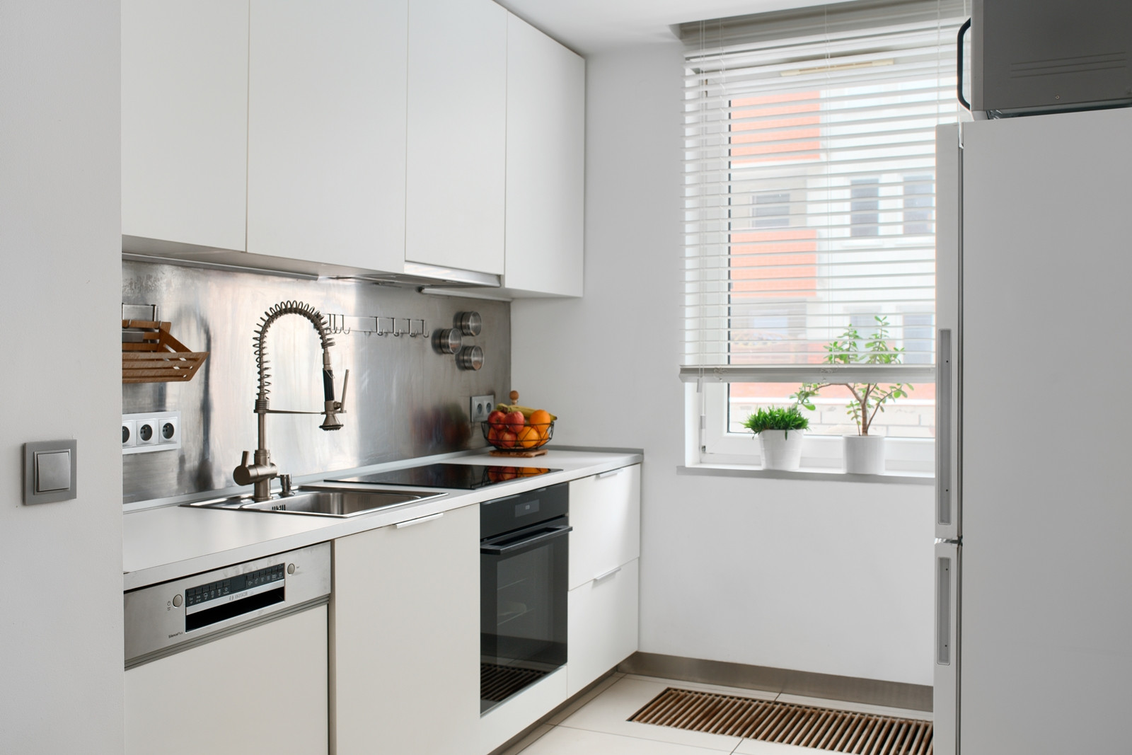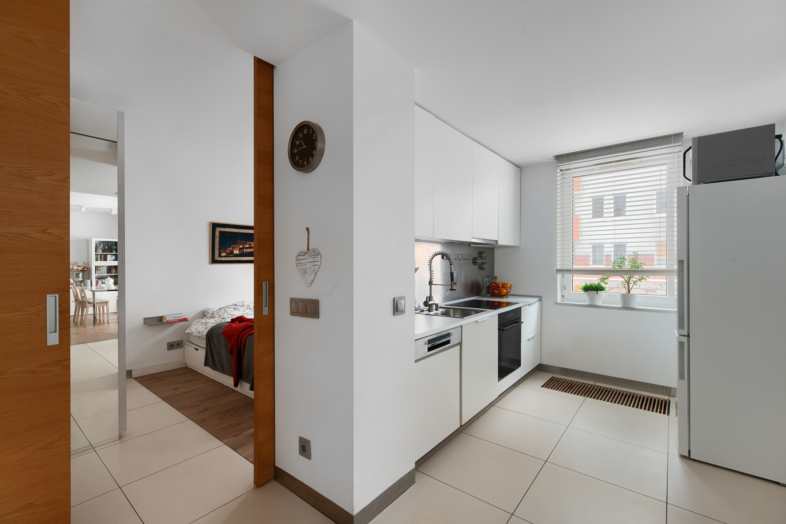 Kuchnia z oknem, w białej zabudowie (osprzęt Blum) otwieranej na dotyk, wyposażona jest w zmywarkę i lodówkę Bosch, płytę indukcyjną i piekarnik Haier.