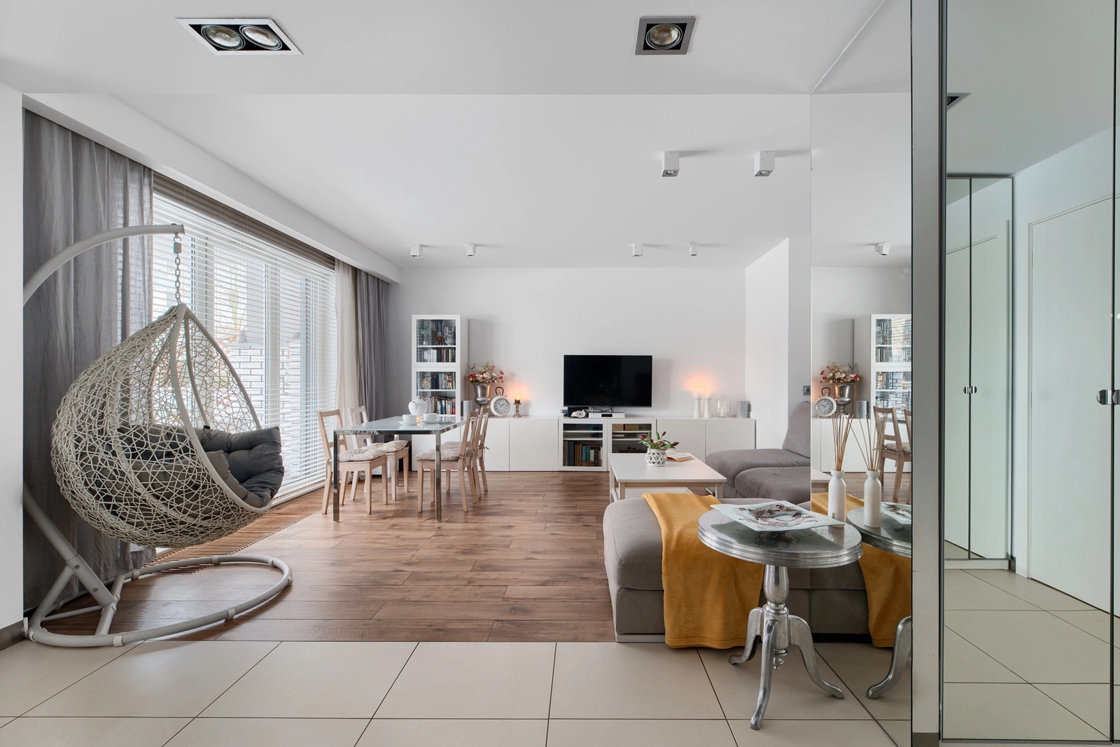 Na całej powierzchni znajdują się płytki podłogowe: w salonie i sypialni w formie imitacji deski, w łazience w kolorach antracyt, a w kuchni i korytarzu w odcieniu kremowym.