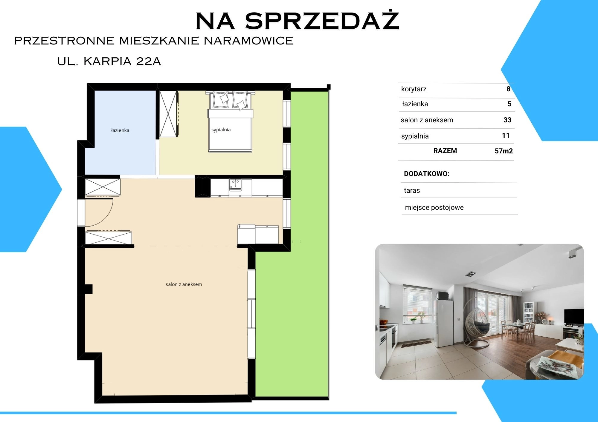 Mieszkanie składa się z salonu z aneksem kuchennym i wyjściem na taras, sypialni, łazienki oraz korytarza. Wnętrzne jest świeżo odmalowane na biało.