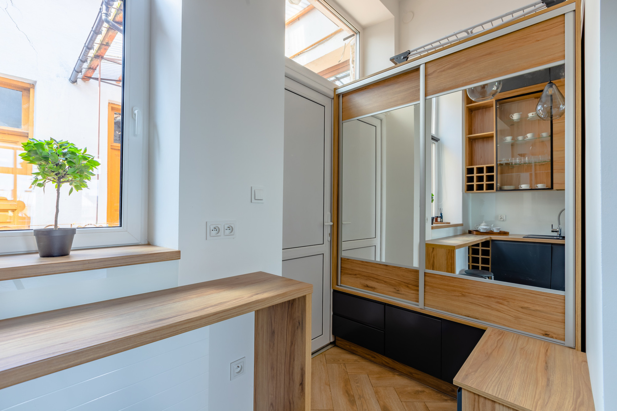 – Korytarz: zabudowany funkcjonalną szafą z lustrem, do przechowywania
