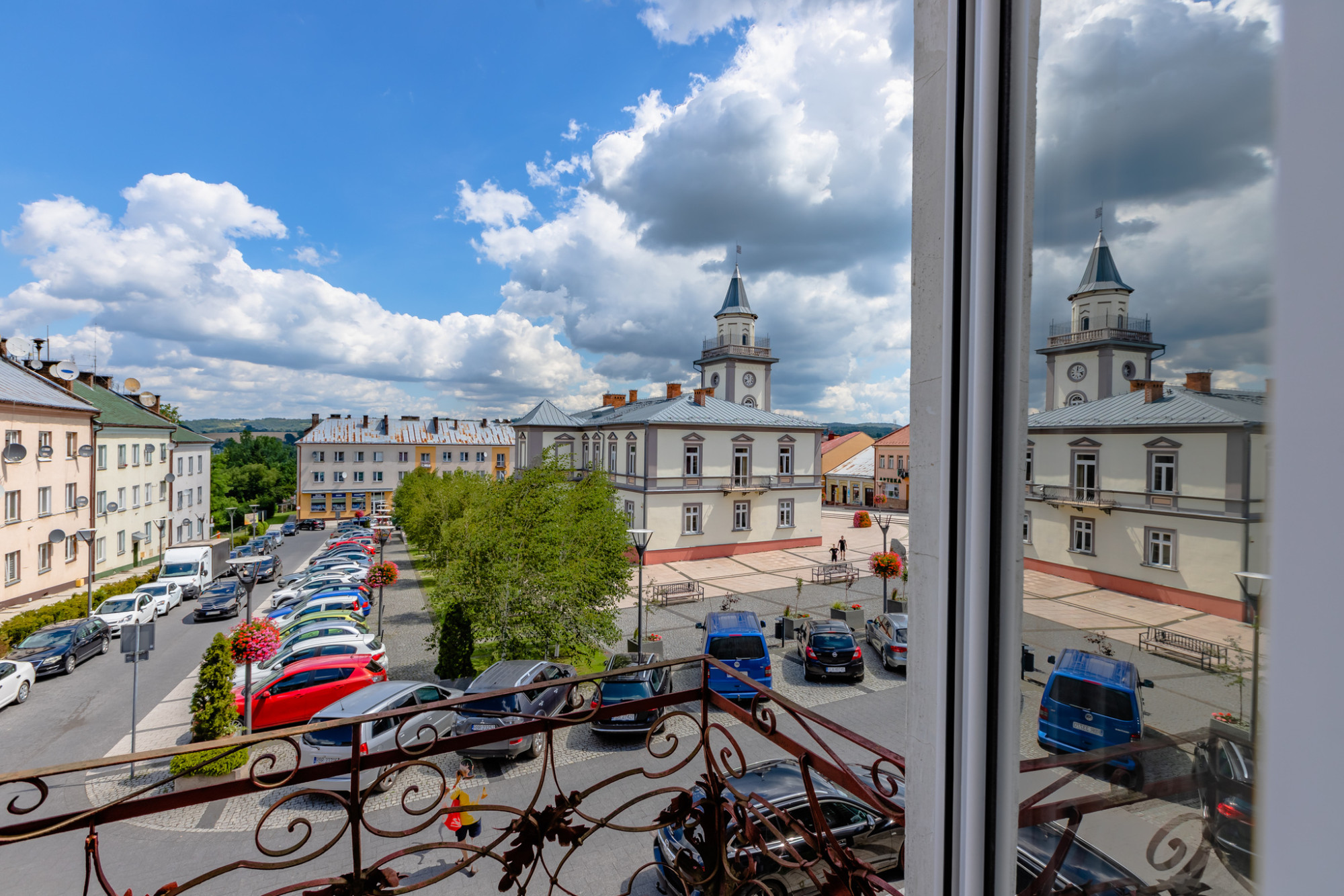 – Salon: przestronny, z wyjściem na balkon z pięknym widokiem na Rynek Główny.