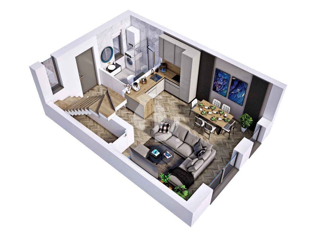 – parter to część dzienna składająca się z przedpokoju, salonu z wyjściem na ogródek, aneksu kuchennego i łazienki.