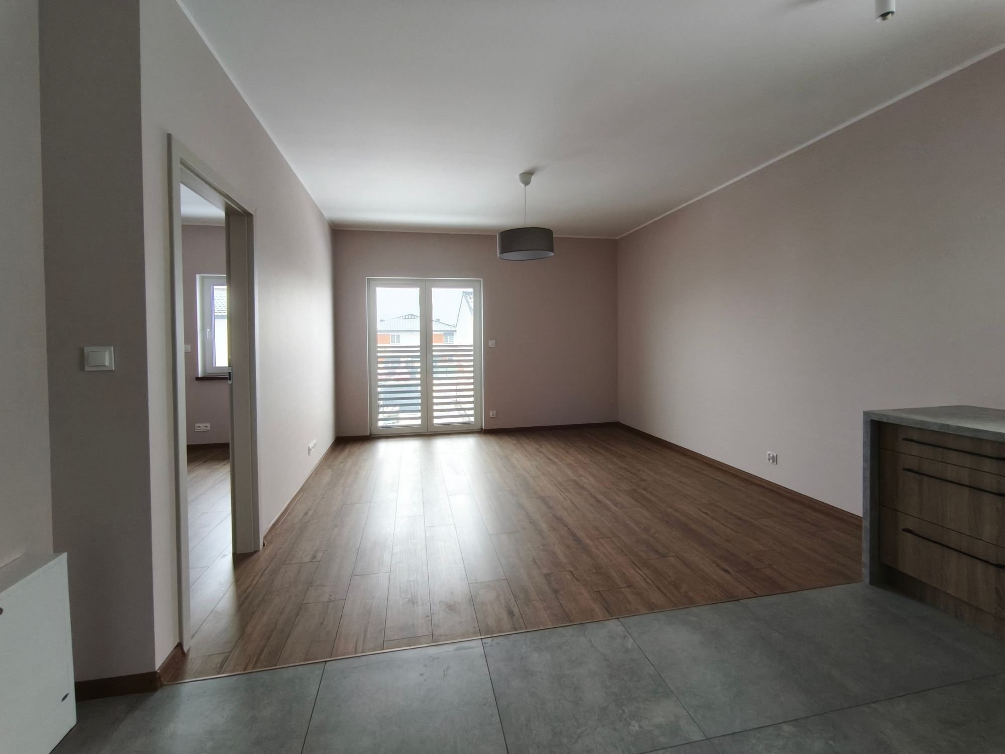 Lokal składa się z przestronnego salonu z aneksem kuchennym, dwóch niezależnych sypialni oraz łazienki. Mieszkanie położone jest na I piętrze w kameralnym budynku. Dodatkowym atutem jest balkon oraz przynależny ogródek, który znacząco zwiększa komfort codziennego użytkowania. Do mieszkania przypisane są dwa miejsca postojowe. Na całej powierzchnie mieszkania rozprowadzono ogrzewanie podłogowe.