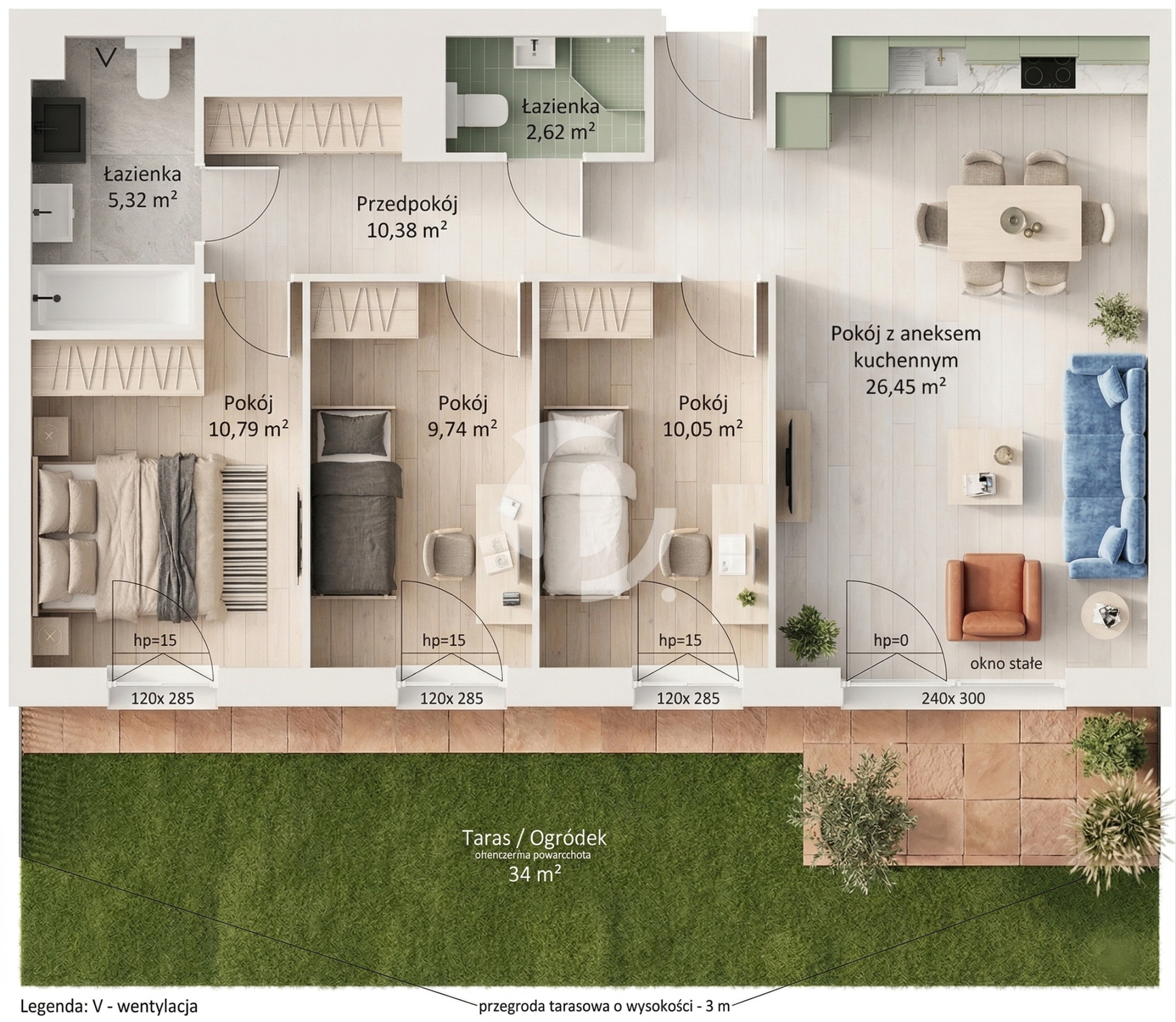 Wizualizacje mają charakter poglądowy i nie stanowią elementu oferty w rozumieniu art. 66 Kodeksu cywilnego. Mieszkanie sprzedawane jest w stanie deweloperskim.