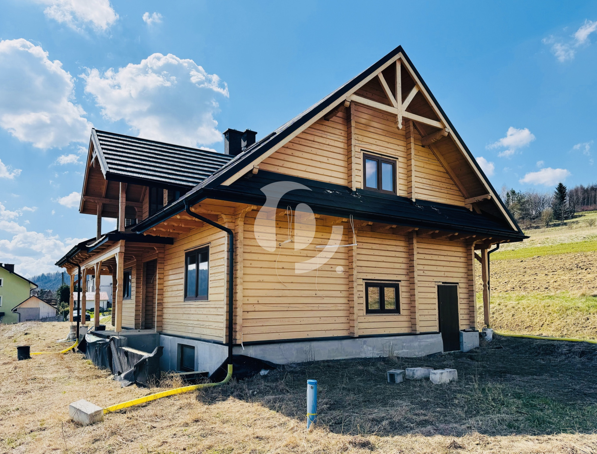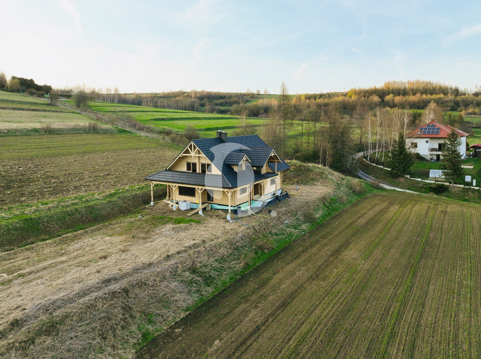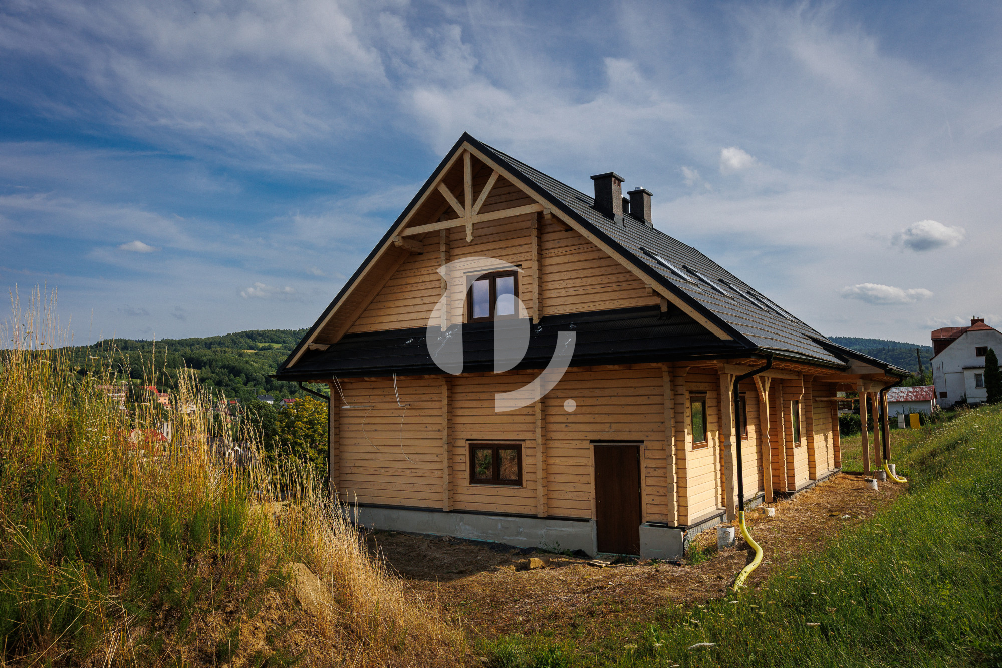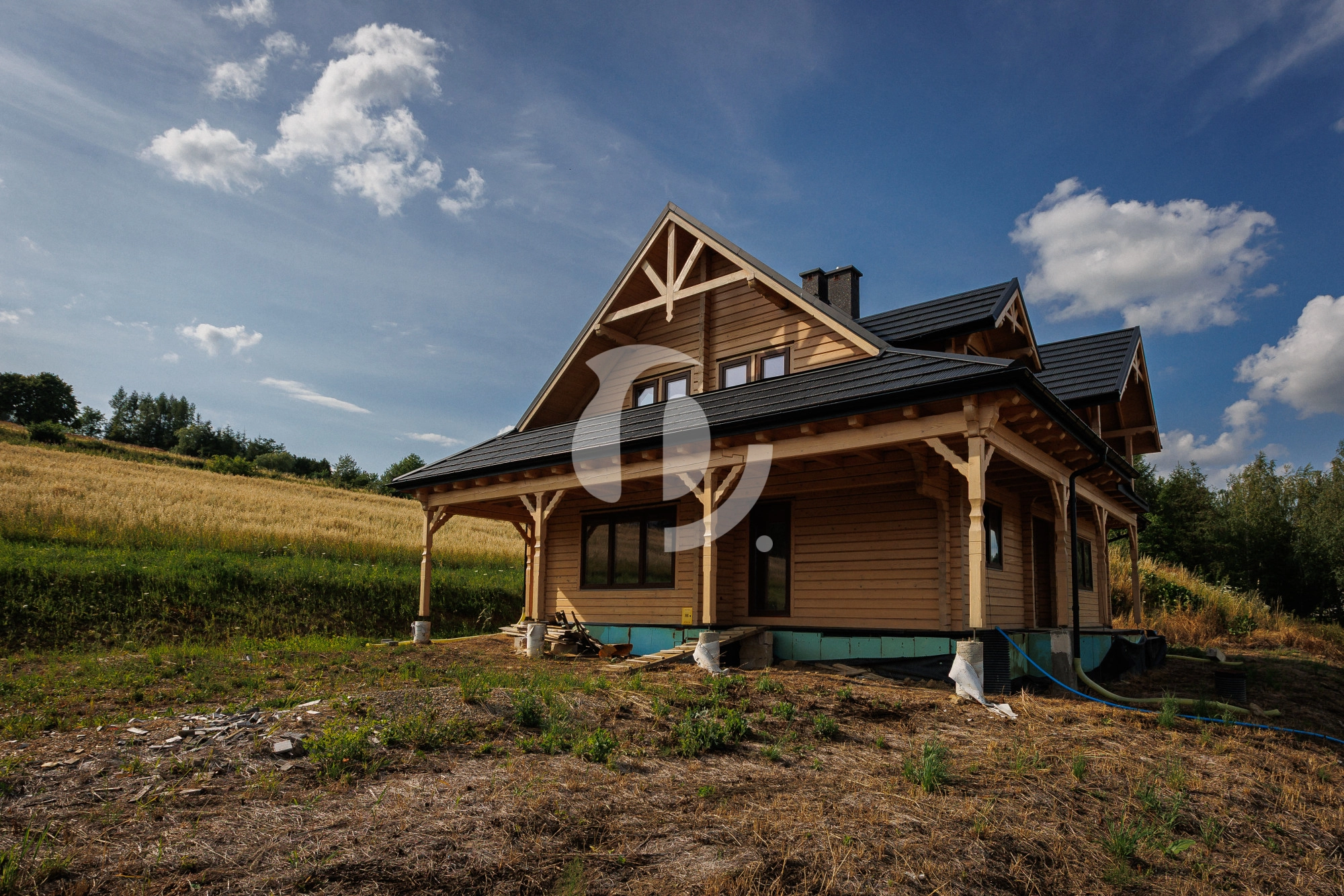 Dom wzniesiony został z najwyższej jakości bali drewnianych (14×18 i 14×20 cm), harmonijnie wpisując się w otaczający krajobraz. Architektura budynku inspirowana jest dawnymi domami z regionu, a jego usytuowanie na wzniesieniu gwarantuje piękne widoki i poczucie przestrzeni. Całość przykryta jest dachem krokwiowo-płatwiowym, pokrytym blachodachówką. Fundamenty żelbetowe, okna częściowo PCV i częściowo drewniane. Budynek gotowy do wykończenia według gustu i potrzeb nowego właściciela.