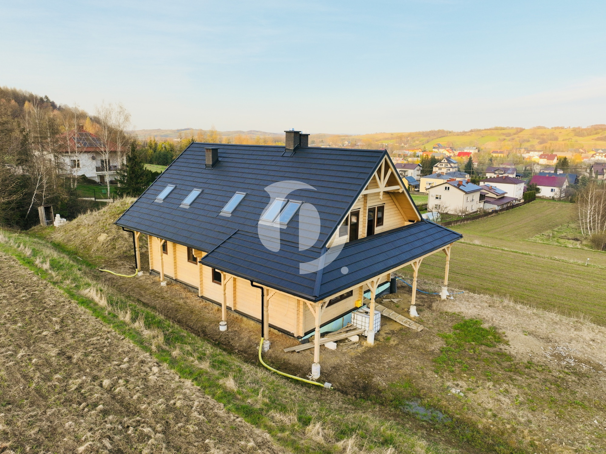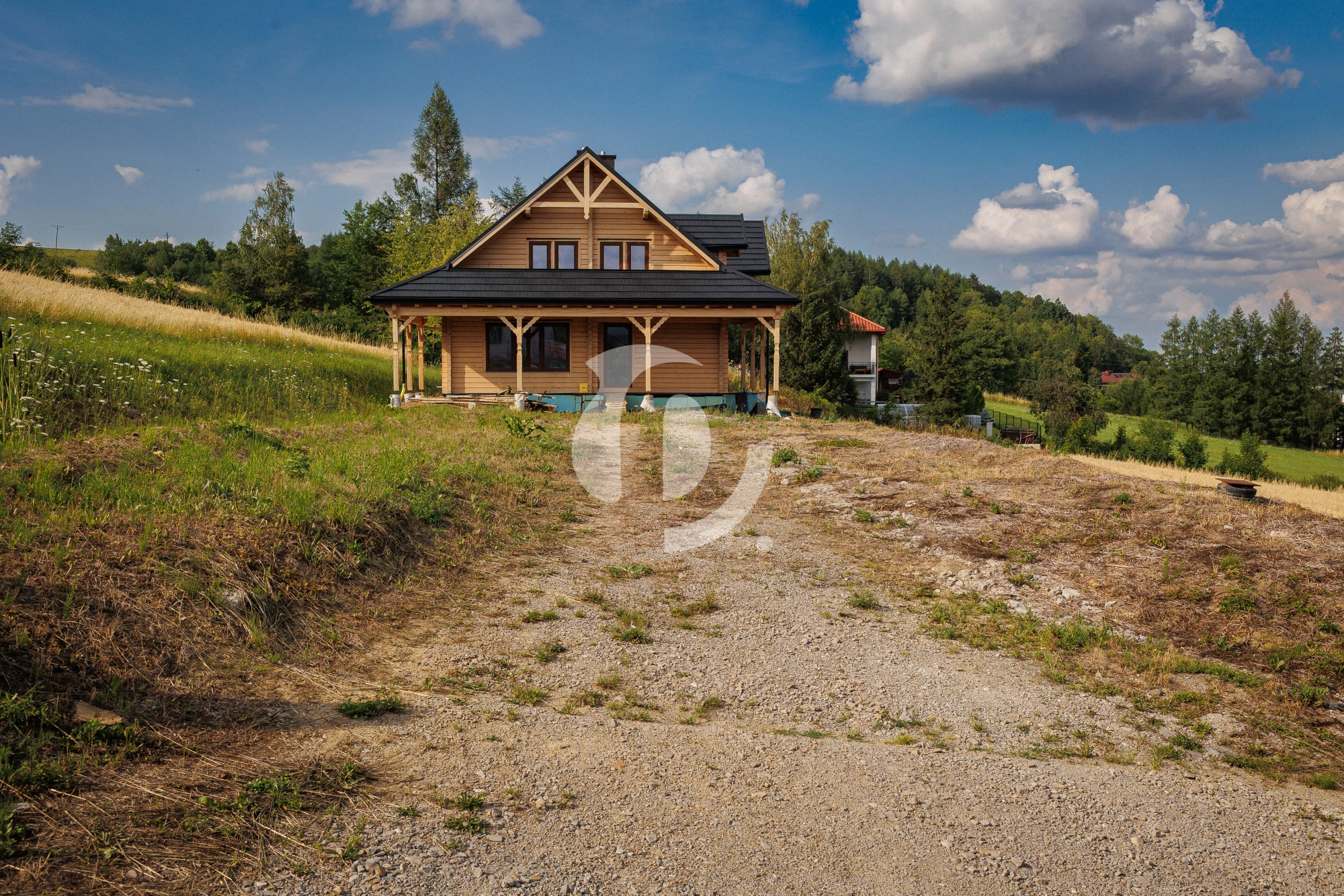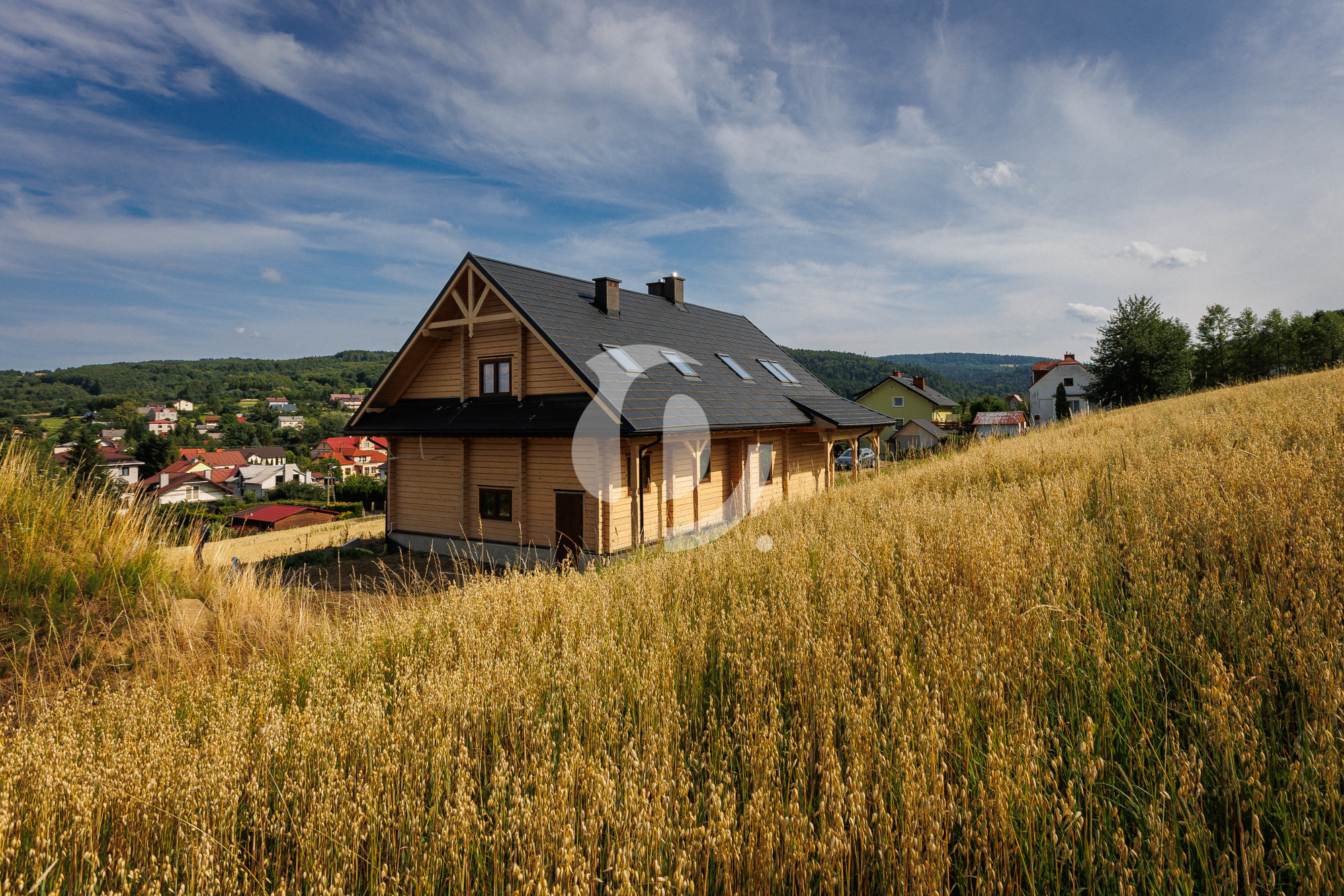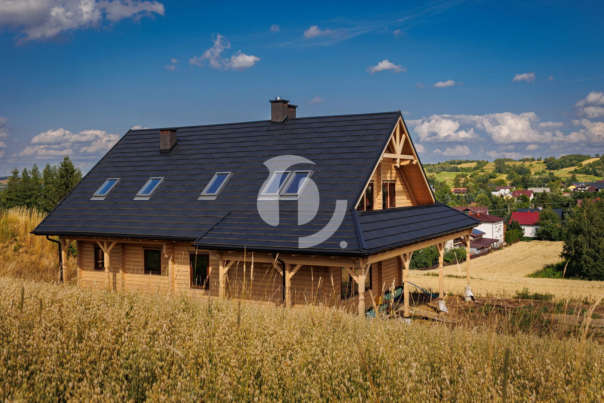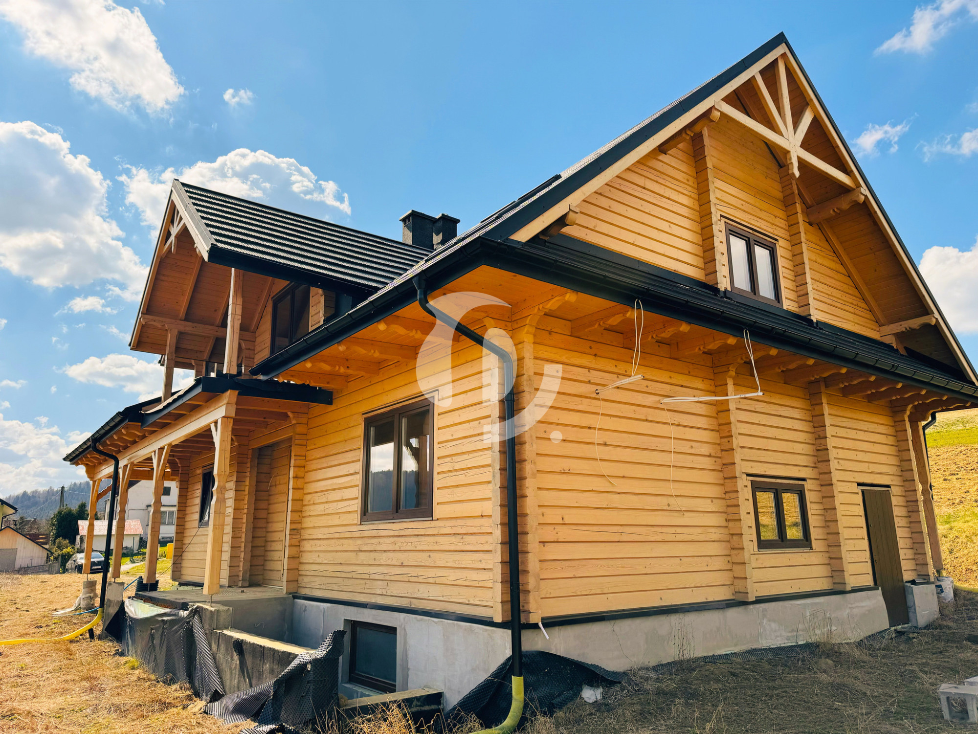 Dom wzniesiony został z najwyższej jakości bali drewnianych (14×18 i 14×20 cm), harmonijnie wpisując się w otaczający krajobraz. Architektura budynku inspirowana jest dawnymi domami z regionu, a jego usytuowanie na wzniesieniu gwarantuje piękne widoki i poczucie przestrzeni. Całość przykryta jest dachem krokwiowo-płatwiowym, pokrytym blachodachówką. Fundamenty żelbetowe, okna częściowo PCV i częściowo drewniane. Budynek gotowy do wykończenia według gustu i potrzeb nowego właściciela.