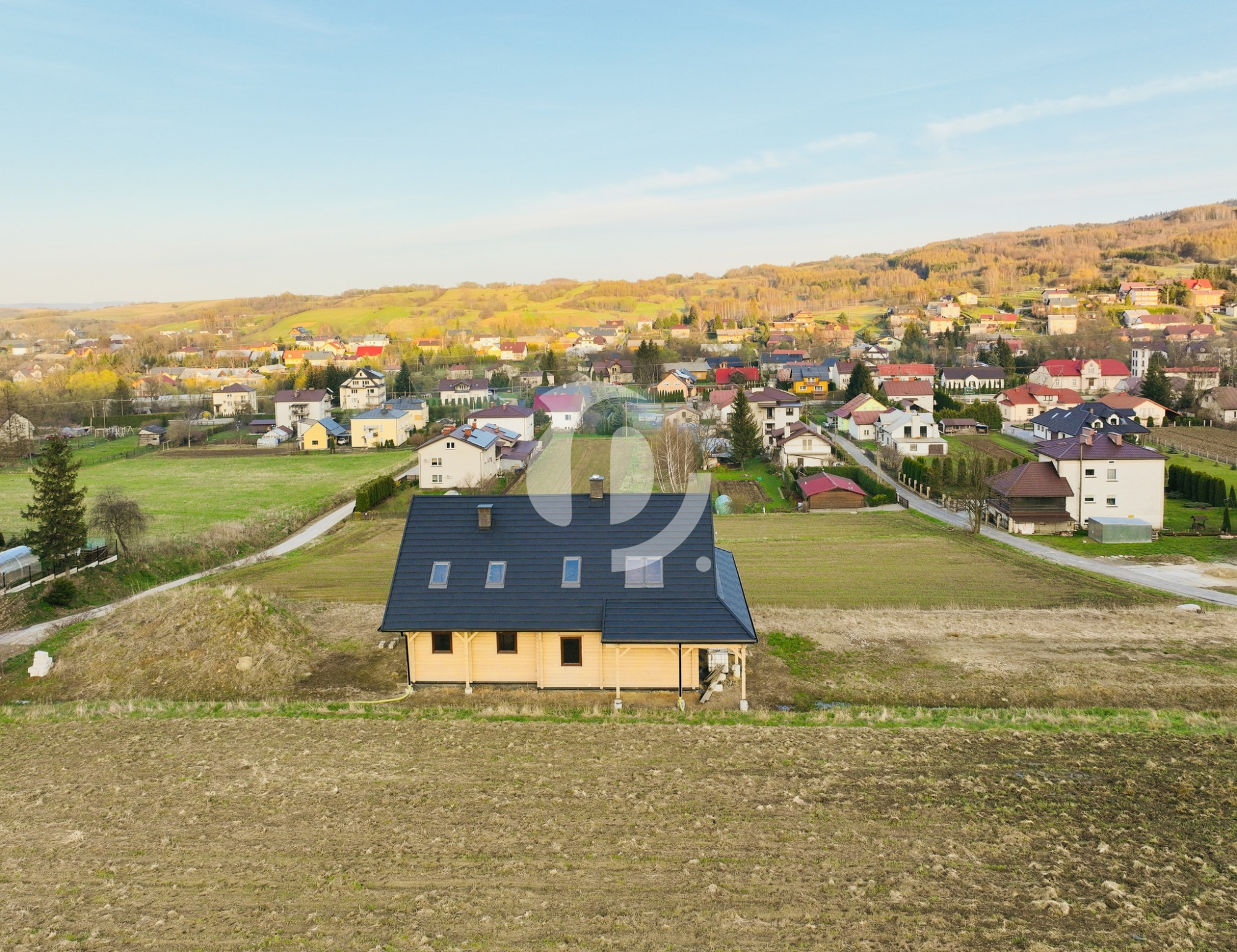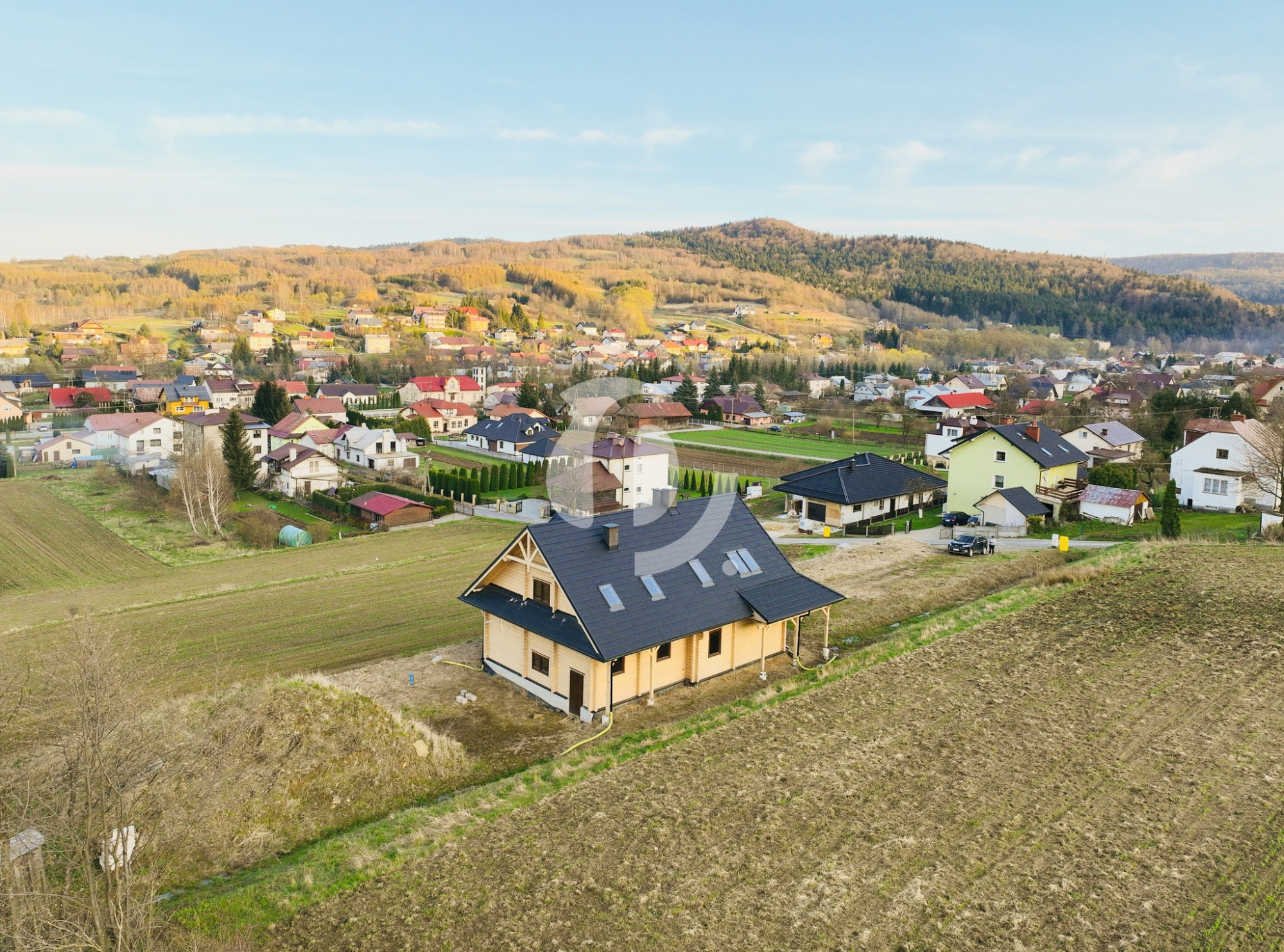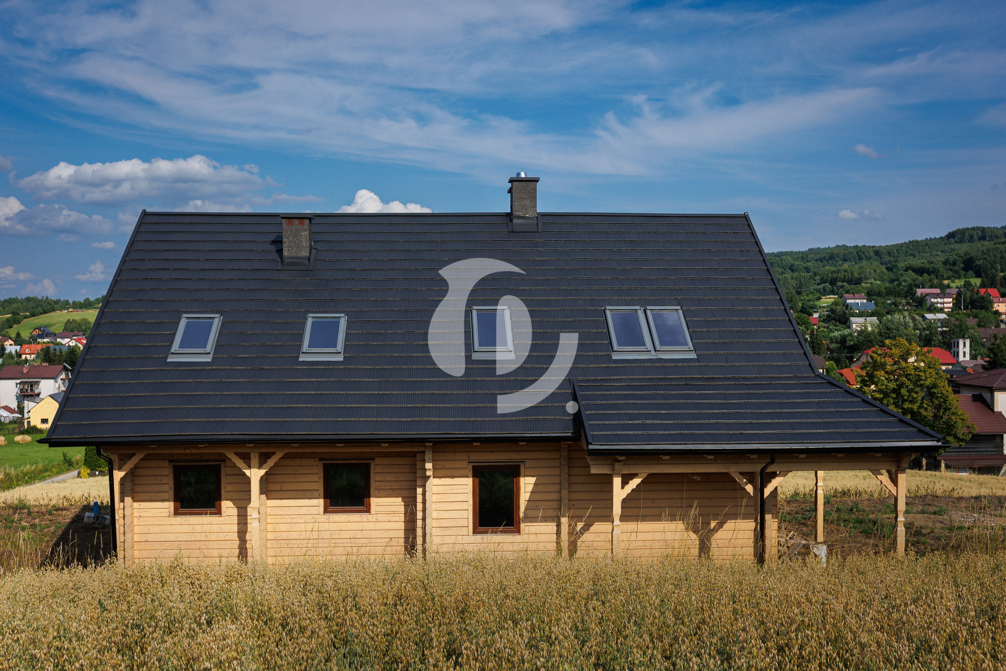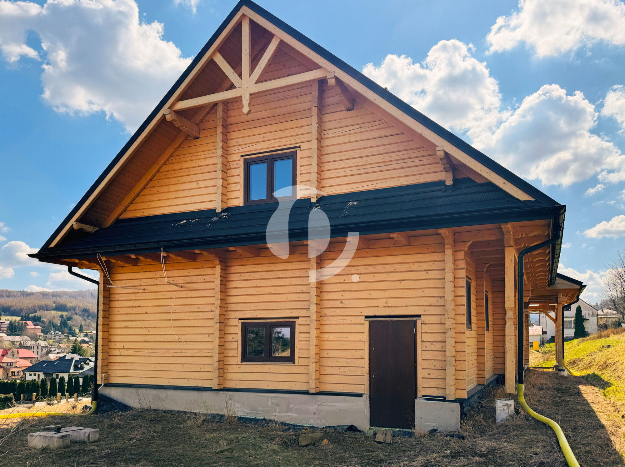 Dom wzniesiony został z najwyższej jakości bali drewnianych (14×18 i 14×20 cm), harmonijnie wpisując się w otaczający krajobraz. Architektura budynku inspirowana jest dawnymi domami z regionu, a jego usytuowanie na wzniesieniu gwarantuje piękne widoki i poczucie przestrzeni. Całość przykryta jest dachem krokwiowo-płatwiowym, pokrytym blachodachówką. Fundamenty żelbetowe, okna częściowo PCV i częściowo drewniane. Budynek gotowy do wykończenia według gustu i potrzeb nowego właściciela.