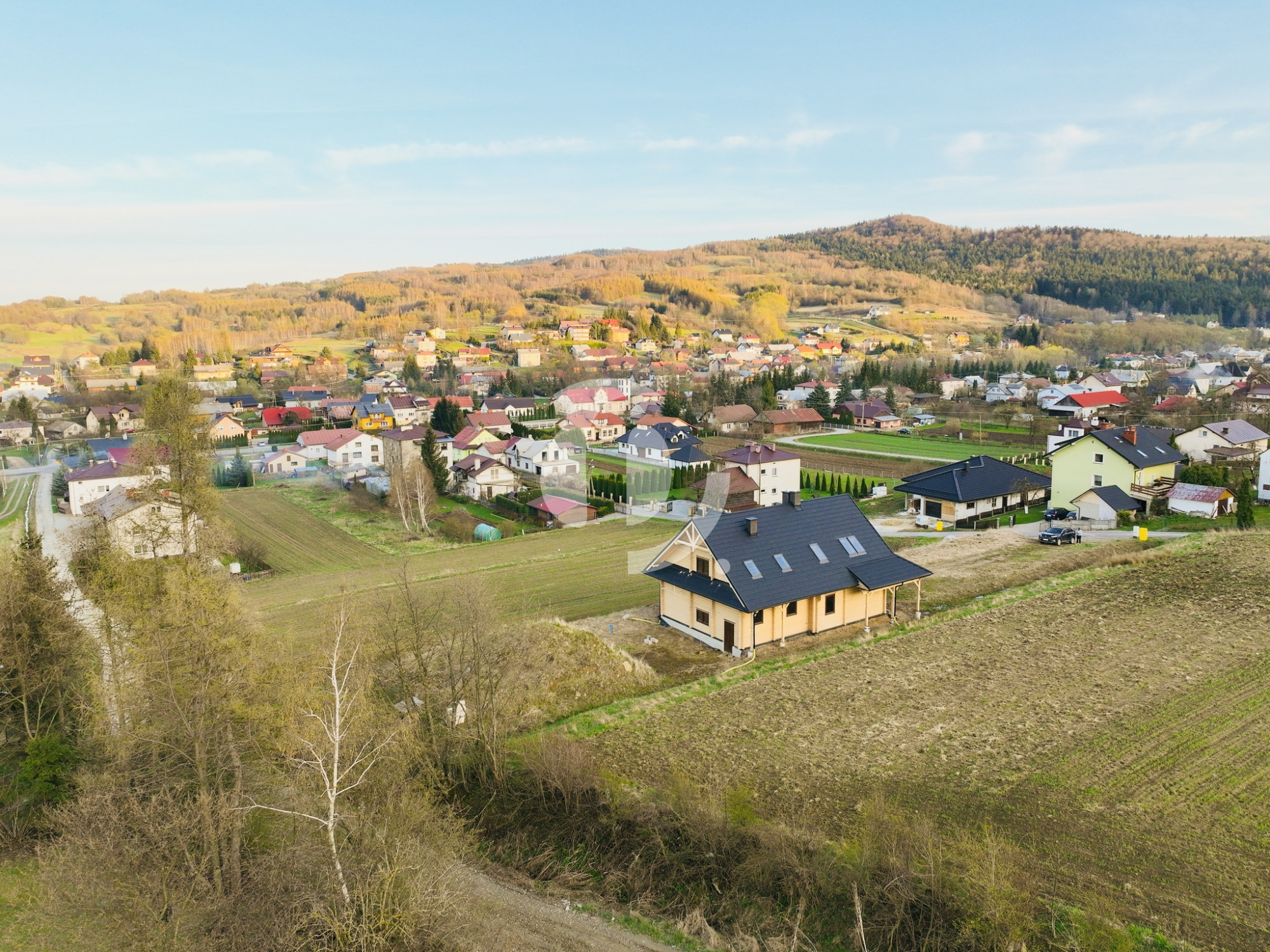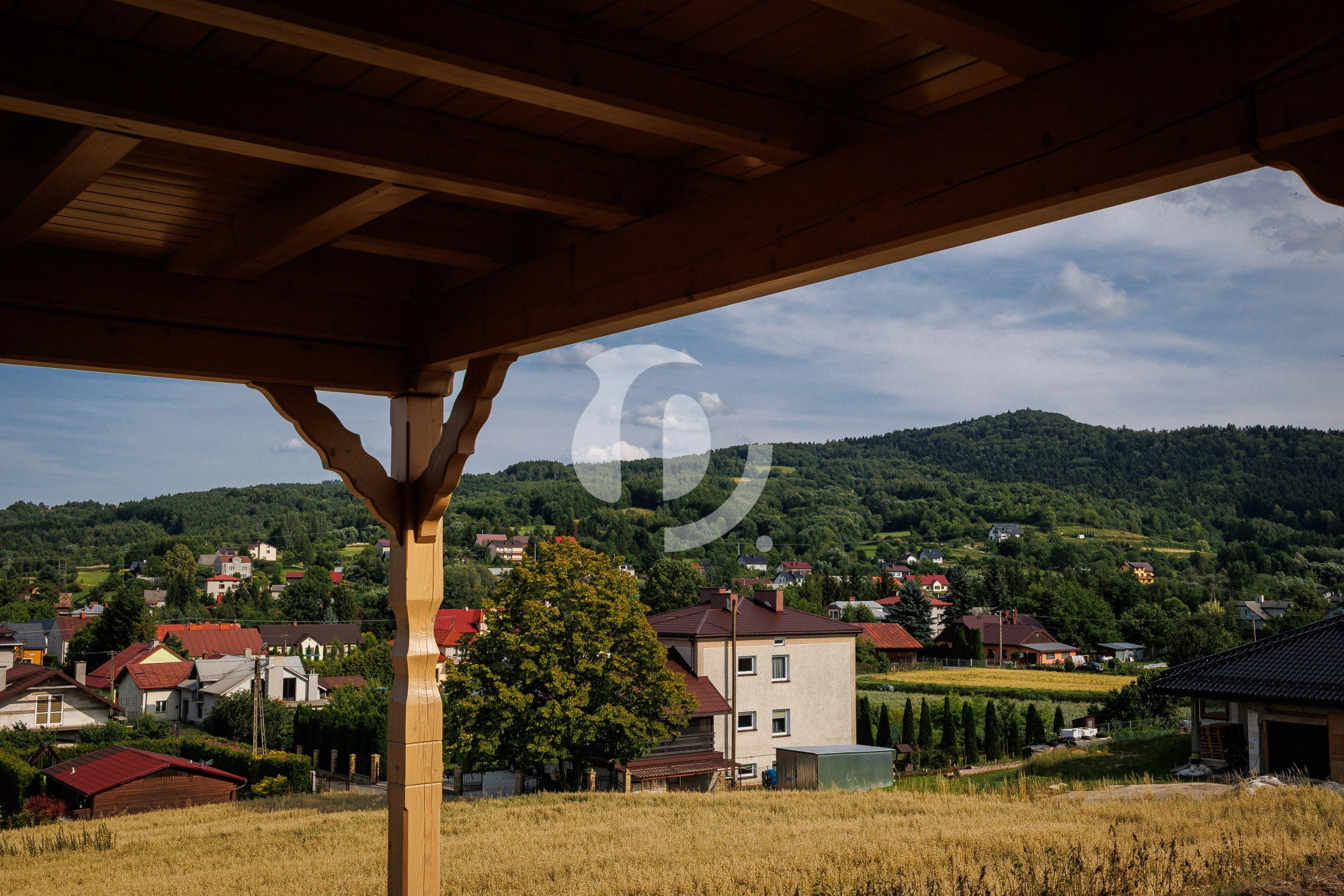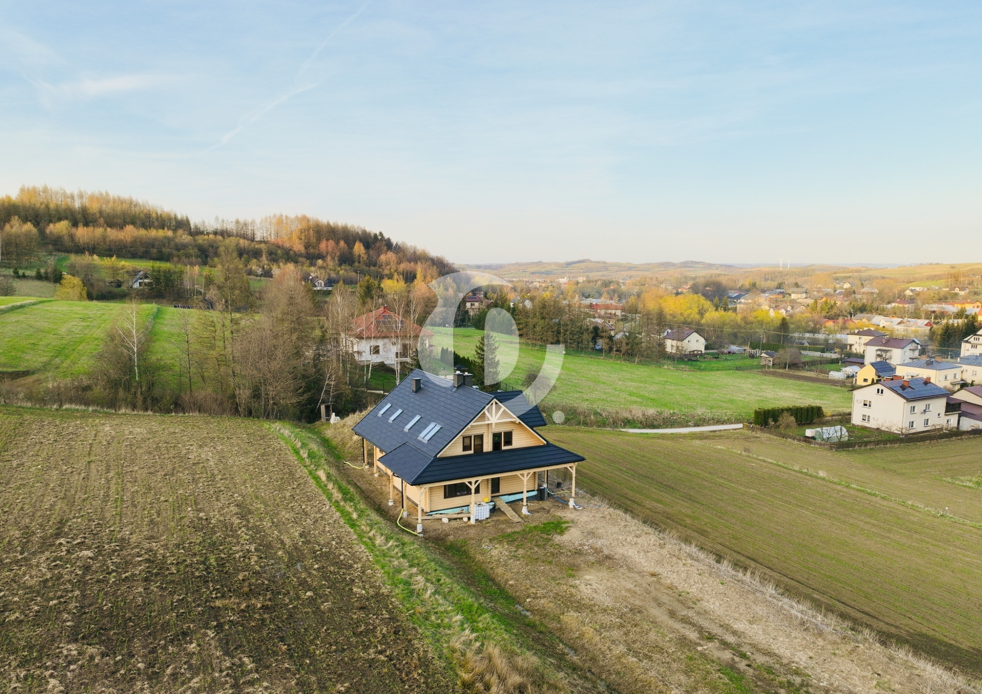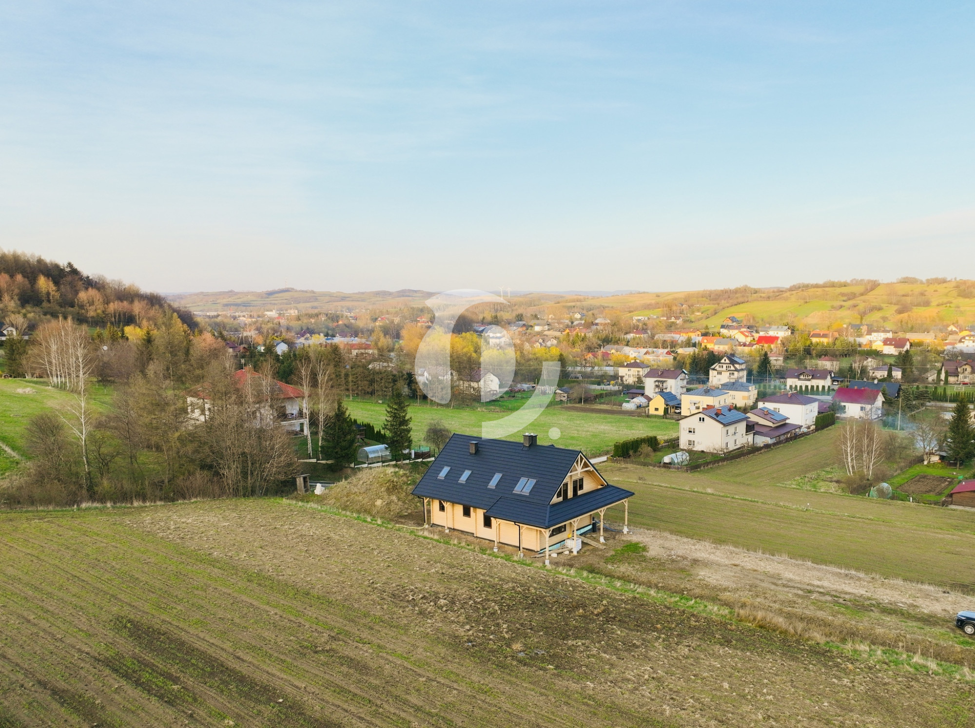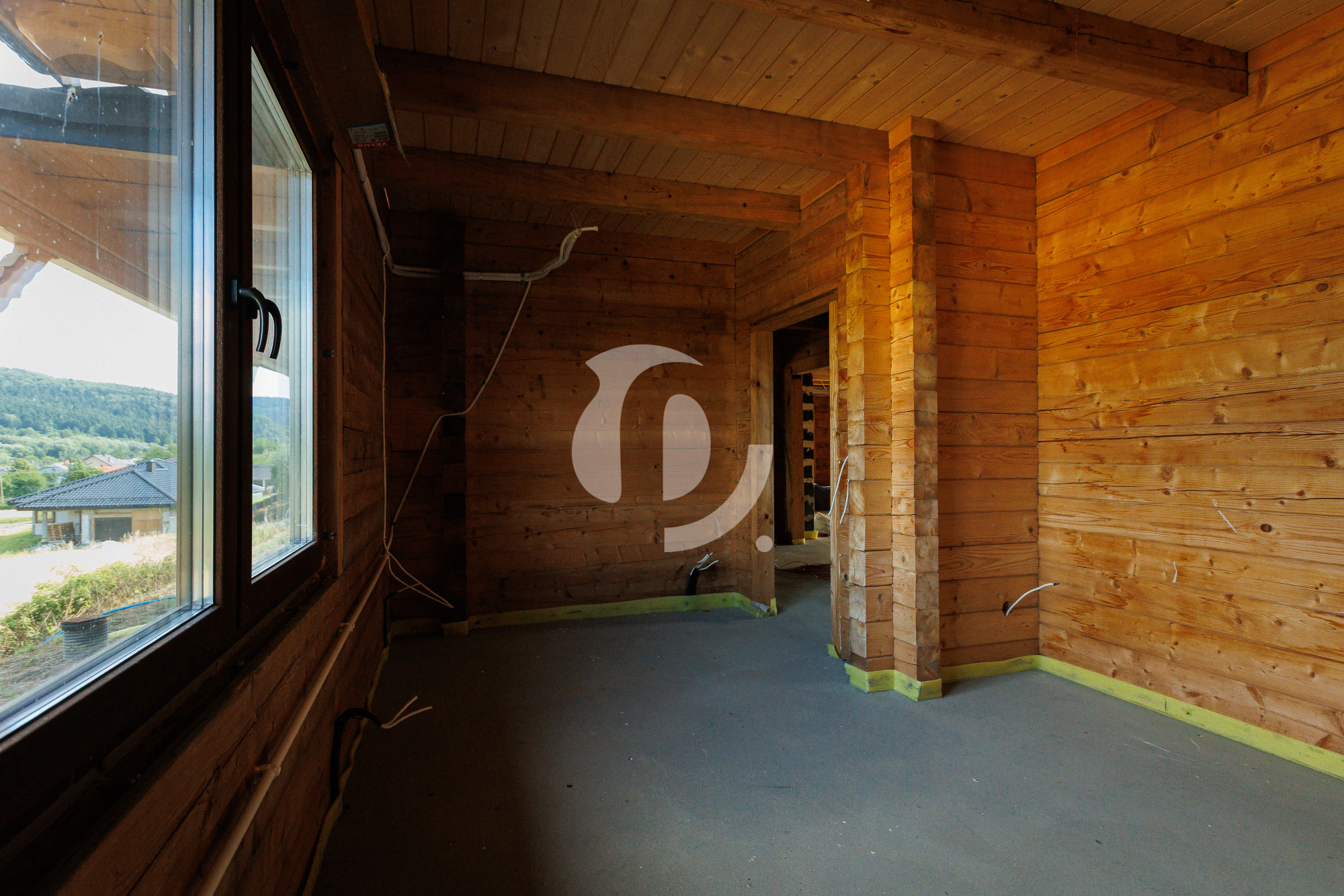 Dom wzniesiony został z najwyższej jakości bali drewnianych (14×18 i 14×20 cm), harmonijnie wpisując się w otaczający krajobraz. Architektura budynku inspirowana jest dawnymi domami z regionu, a jego usytuowanie na wzniesieniu gwarantuje piękne widoki i poczucie przestrzeni. Całość przykryta jest dachem krokwiowo-płatwiowym, pokrytym blachodachówką. Fundamenty żelbetowe, okna częściowo PCV i częściowo drewniane. Budynek gotowy do wykończenia według gustu i potrzeb nowego właściciela.