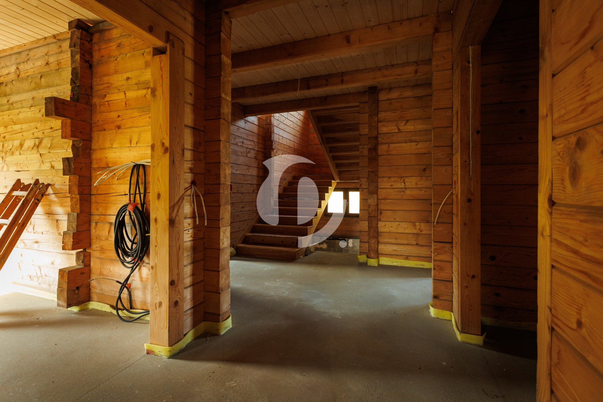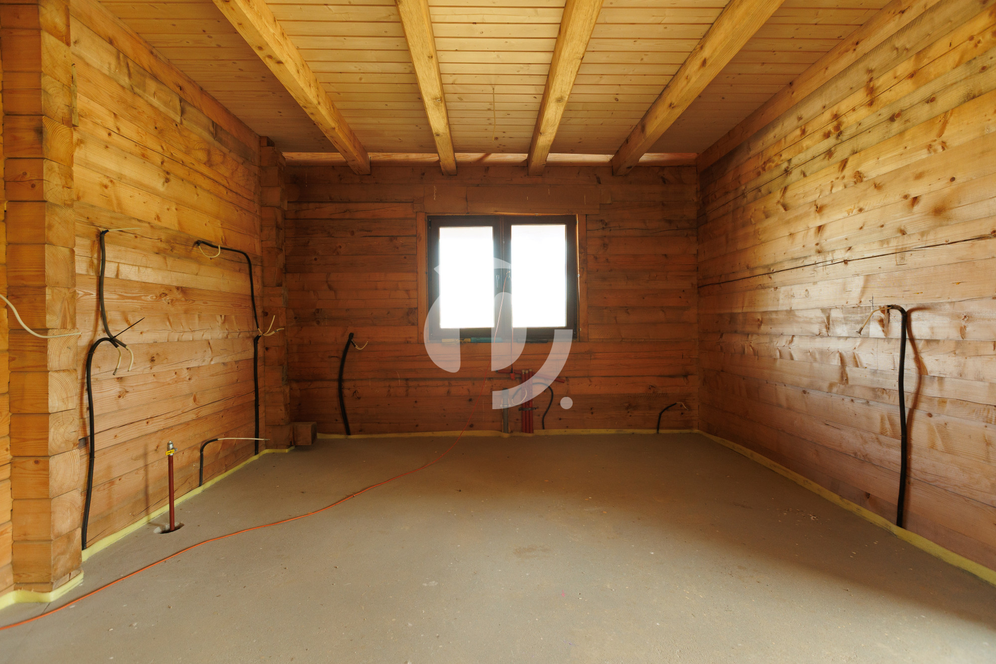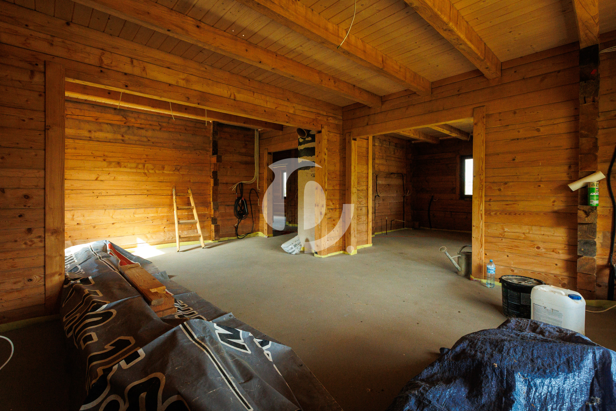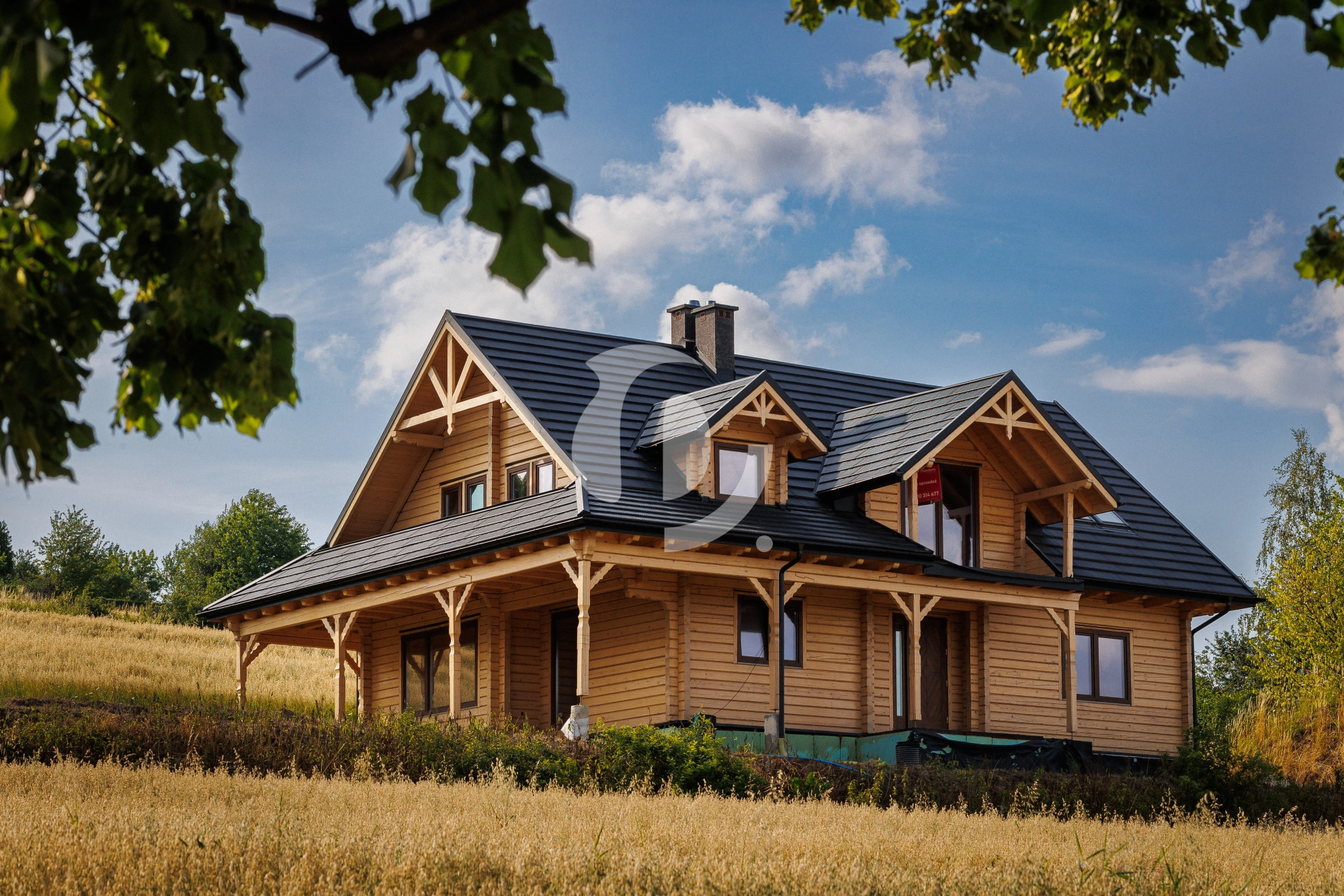 Dom wzniesiony został z najwyższej jakości bali drewnianych (14×18 i 14×20 cm), harmonijnie wpisując się w otaczający krajobraz. Architektura budynku inspirowana jest dawnymi domami z regionu, a jego usytuowanie na wzniesieniu gwarantuje piękne widoki i poczucie przestrzeni. Całość przykryta jest dachem krokwiowo-płatwiowym, pokrytym blachodachówką. Fundamenty żelbetowe, okna częściowo PCV i częściowo drewniane. Budynek gotowy do wykończenia według gustu i potrzeb nowego właściciela.