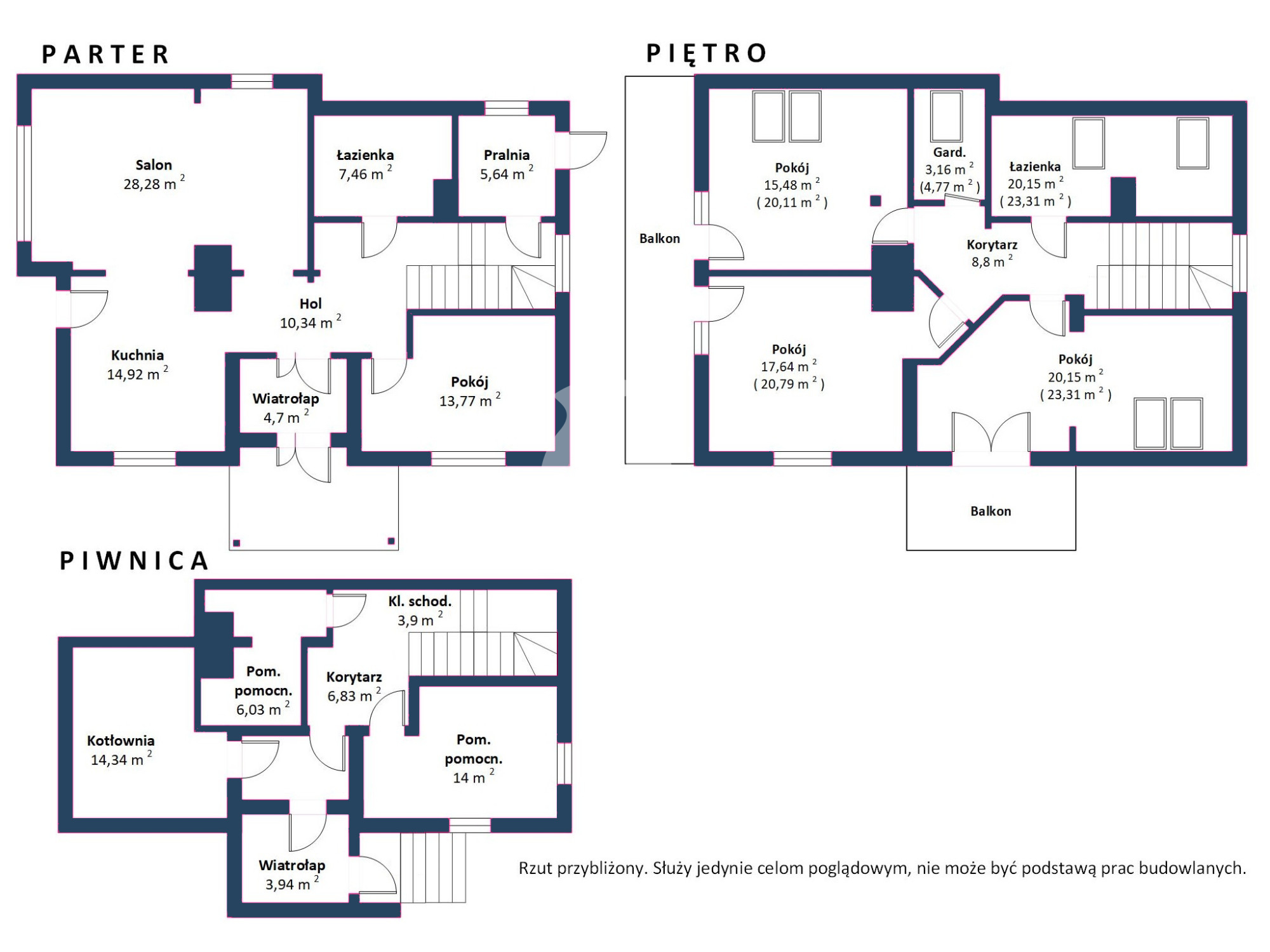 – Kondygnacje: 3 (piwnica, parter, poddasze użytkowe)