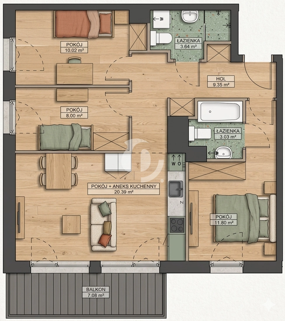 • 3 ustawne sypialnie (11,80 m², 10,02 m² oraz 8,00 m²)