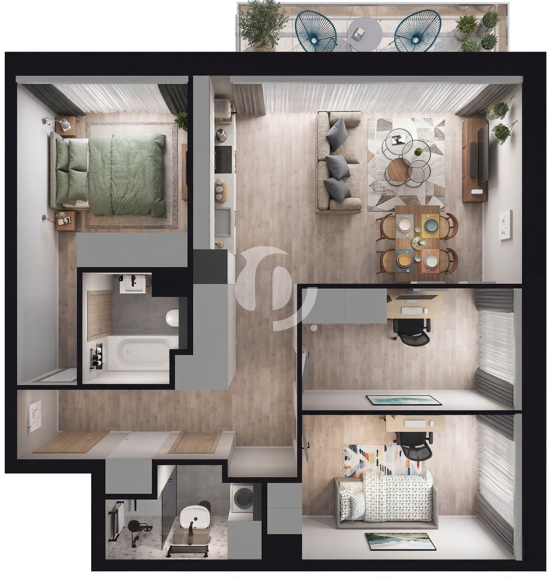 Wizualizacje mają charakter poglądowy i nie stanowią elementu oferty w rozumieniu art. 66 Kodeksu cywilnego. Mieszkanie sprzedawane jest w stanie deweloperskim.
