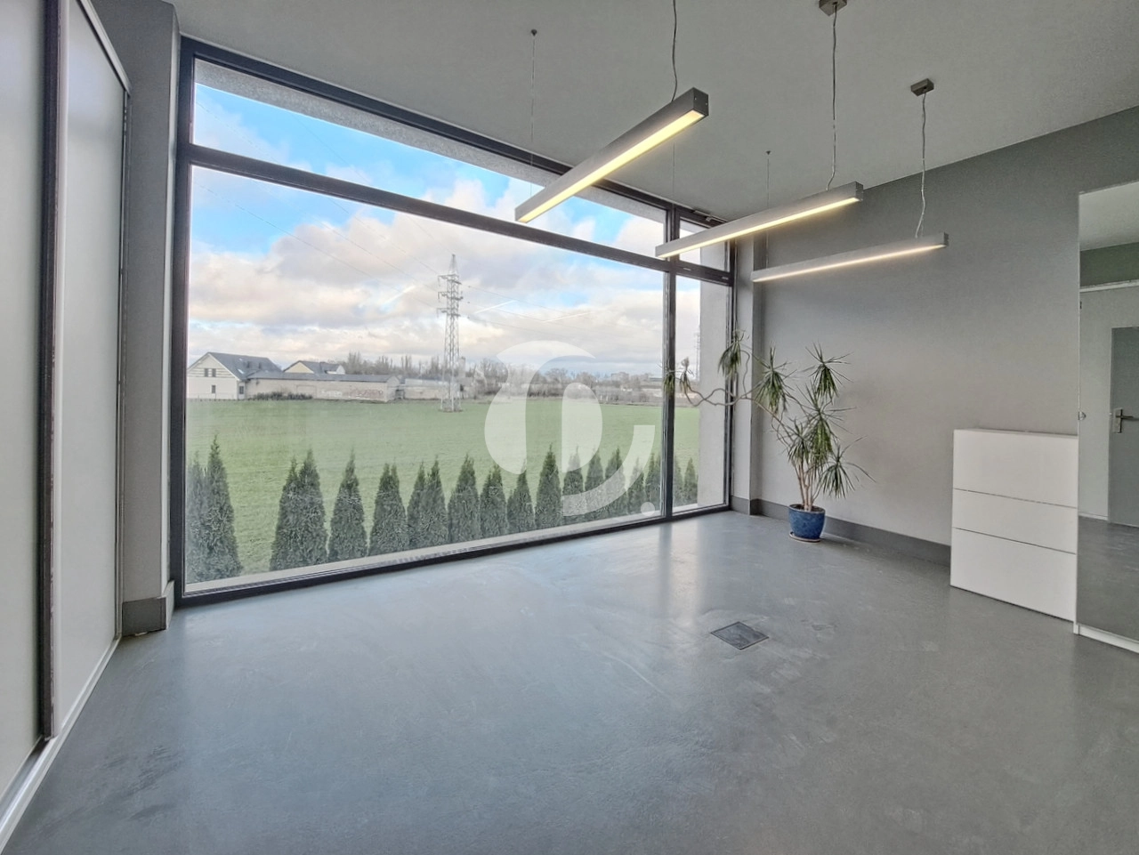 Mimo, że z okien tego biura widać pole i luźną zabudowę jednorodzinną, to jednak w sąsiedztwie znajdują się niezbędne punkty handlowo-usługowe (w tym gastronomia).