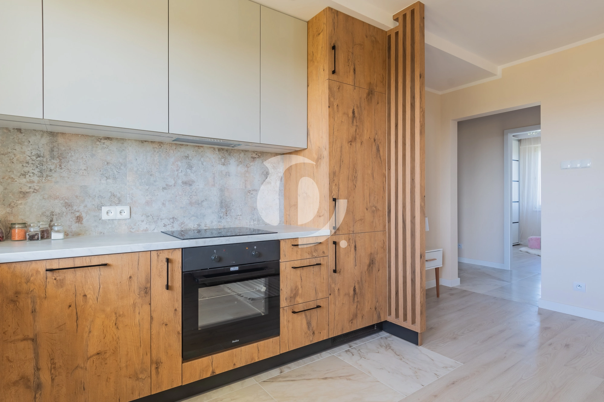 Kaszmirowa zabudowa meblowa w aneksie kuchennym i pojemna szafa garderobiana w przedpokoju zostały wykonane przez stolarza z dbałością o funkcjonalność i maksymalne wykorzystanie przestrzeni. Zabudowa kuchenna została wyposażona w nowe sprzęty AGD w zabudowie: zmywarka 60 cm, piekarnik, a także płytę indukcyjną oraz pochłaniacz – sprzęty są objęte 2 -letnią gwarancją.