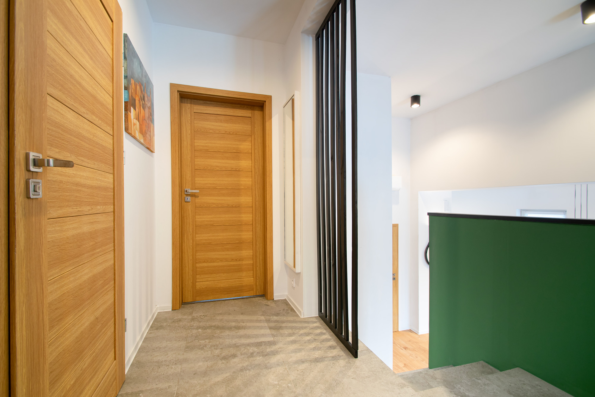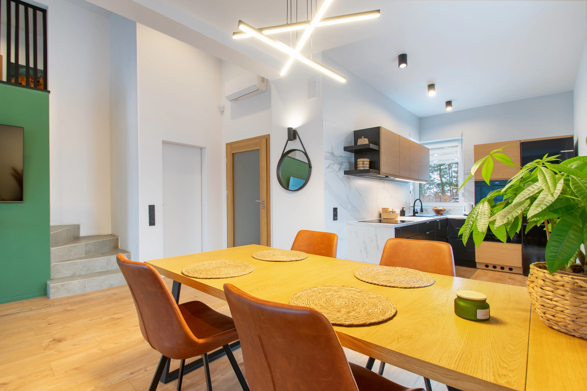 Dom wyróżnia się funkcjonalnym rozkładem pomieszczeń, który zapewnia komfort zarówno rodzinie, jak i osobom pracującym zdalnie. Wnętrza są jasne i przytulne, a układ daje dużą elastyczność aranżacyjną.