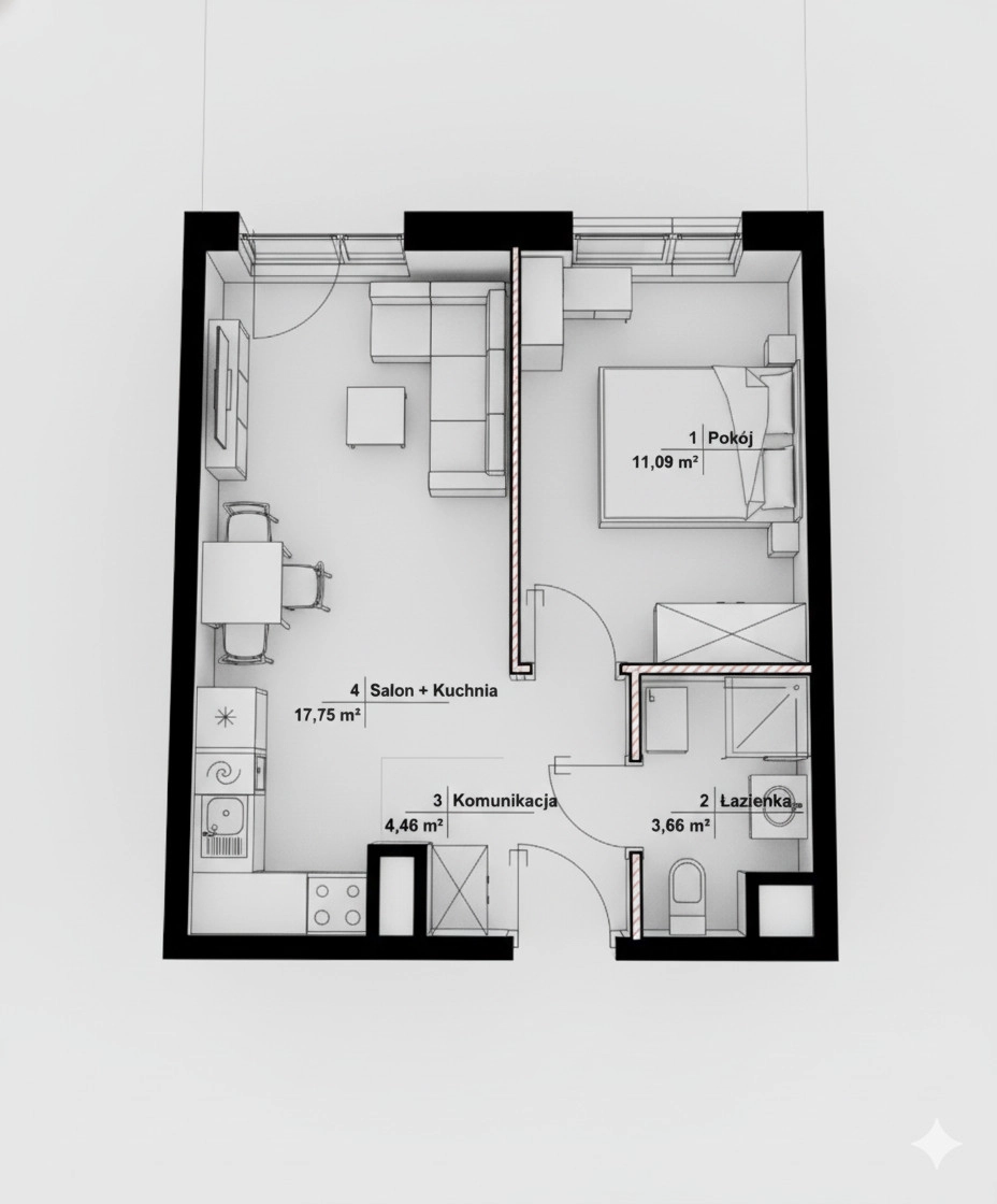 Rzut oraz wizualizacje w ofercie przedstawiają przykładowy sposób aranżacji wnętrza. Powyższa oferta ma charakter informacyjny i nie stanowi oferty handlowej w rozumieniu art. 66 §1 Kodeksu Cywilnego.