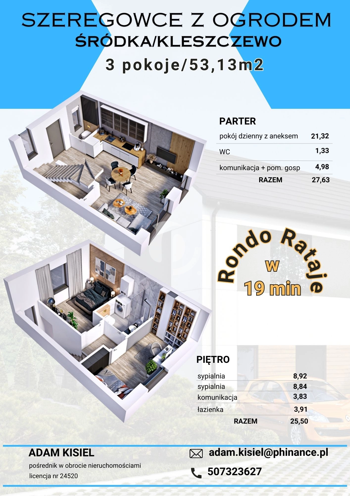 Oferujemy 3-pokojowy dom w zabudowie szeregowej o powierzchni 53m².