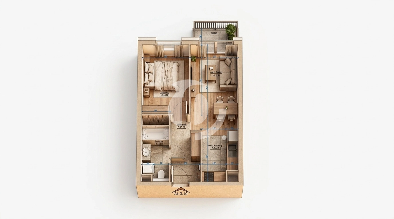 Rzut oraz wizualizacje w ofercie przedstawiają przykładowy sposób aranżacji wnętrza. Powyższa oferta ma charakter informacyjny i nie stanowi oferty handlowej w rozumieniu art. 66 §1 Kodeksu Cywilnego.