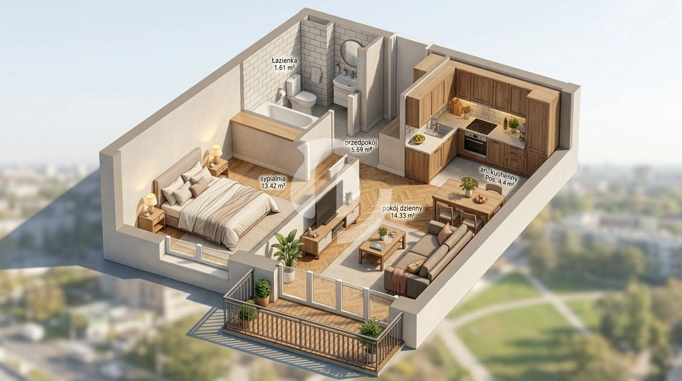 2 Pokoje 43 m², 3 piętro – balkon od zachodu! Sklepy, tramwaj, szkoły i tereny zielone – wszystko pod domem.